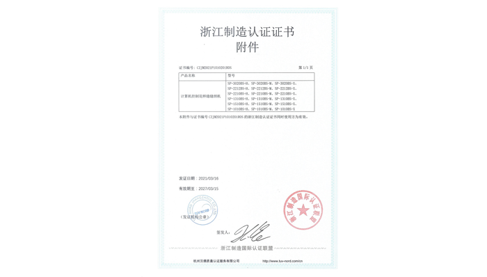 舒普公司的电子花样机系列产品,符合“浙江制造”团体标准T/ZZB 1313—2019《工业用缝纫机 计算机控制花样缝缝纫机》的要求,2021年3月16公司通过“浙江制造”认证