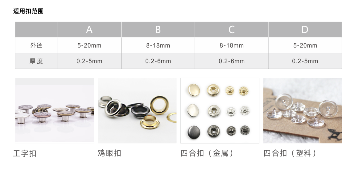 广泛适用于服装、皮具、鞋帽、箱包、工艺品等行业的工字扣、四合扣、铆钉扣、鸡眼扣、撞钉等