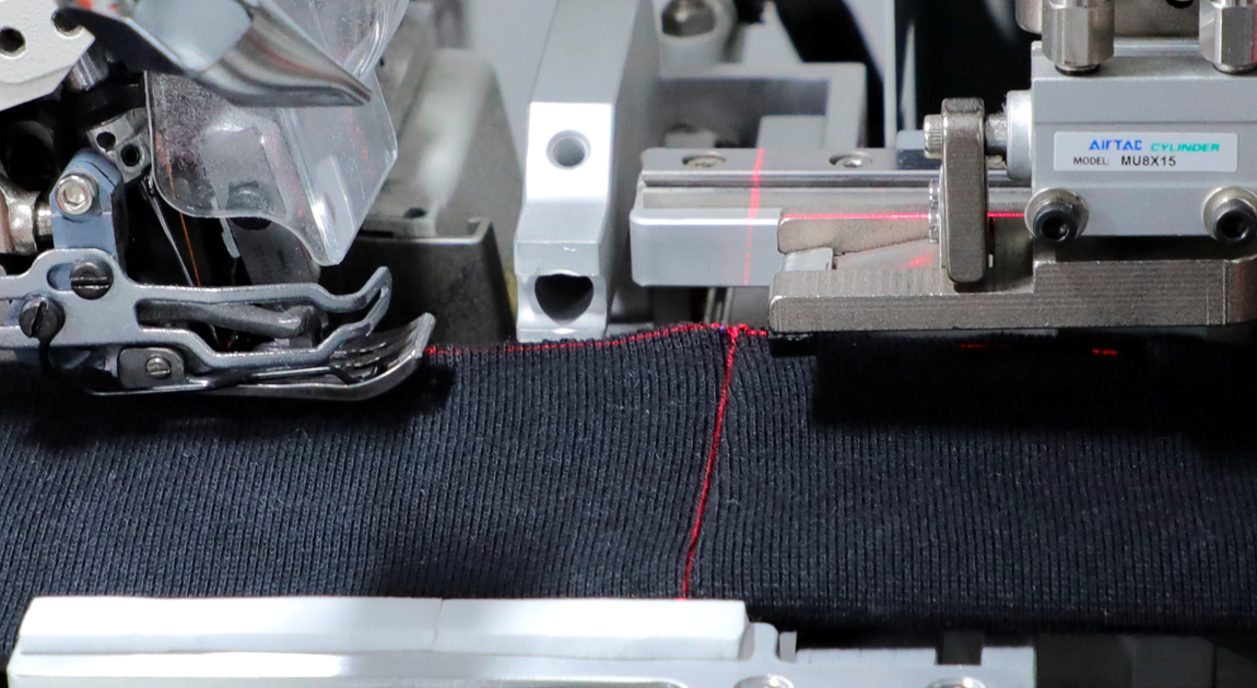 纠偏导向机构:车缝过程中自动感应衣料边距并及时纠正,缝制线均匀,无上下波动现象,缝线至罗纹边距一致,无脱缝、错边等不良现象