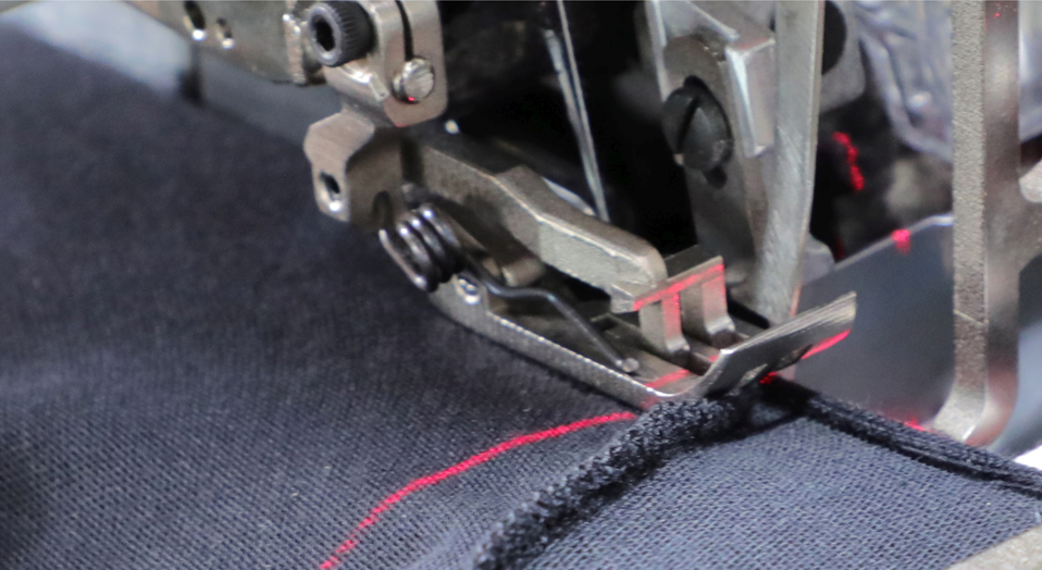 纠偏导向机构:车缝过程中自动感应衣料边距并及时纠正,缝制线均匀,无上下波动现象,缝线至罗纹边距一致,无脱缝、错边等不良现象
