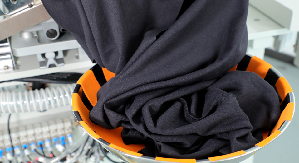 适用针织圆领衫,将领口螺纹与衣片通过上领口机实现上领缝制工艺