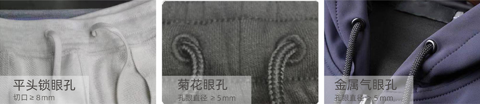 适用于套头衫,休闲裤,拉链风毛衫等平头锁眼孔、菊花眼孔、金属圆形眼的穿绳工艺。